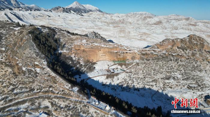 2025年12月22日,航拍下的马蹄寺石窟群银装素裹。 戴文昌摄