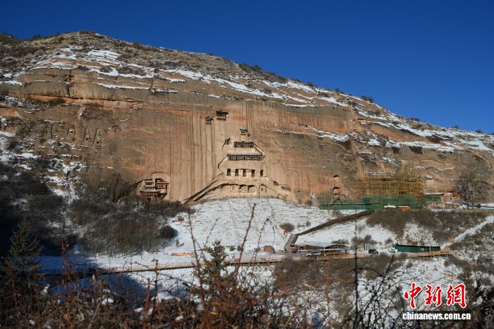 图为崖壁上的千年石窟在白雪映衬下更显古朴沧桑。 戴文昌摄