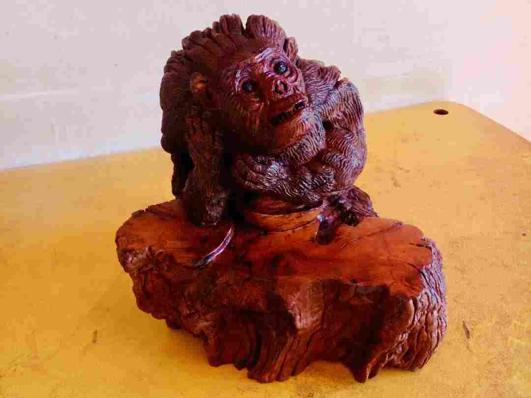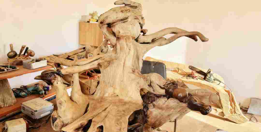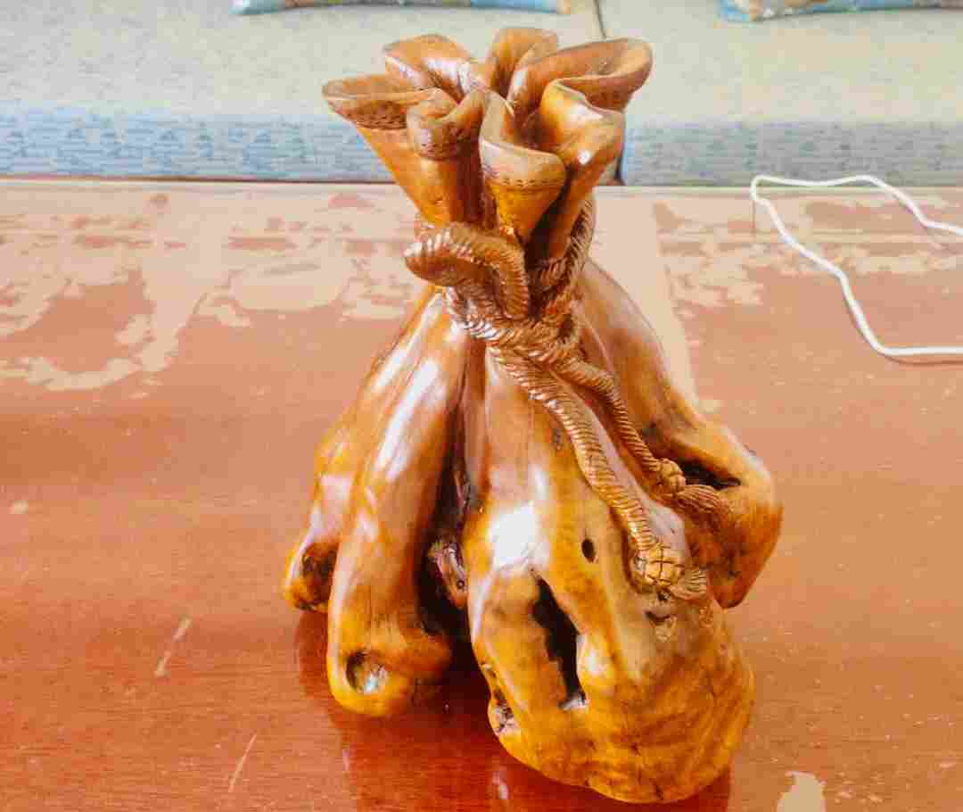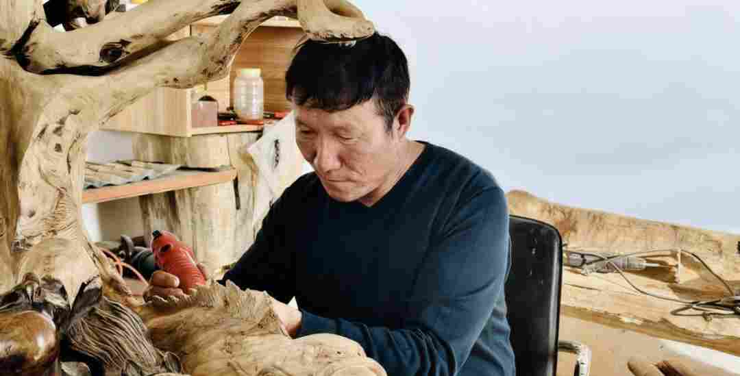 他的创作材料,全部来自大自然的废弃枯根,包括黑格兰树根、杨树根、榆树根、紫檀树根等,只要形态合适,他都会细心收集。“这些树根要是没人管,最后就烂在地里了,太可惜。” 他轻轻抚摸着一块待加工的树根,语气里满是爱惜。创作时,他从不会随意砍伐树木,总是最大程度保留树根的天然形态,再顺着纹理、轮廓构思作品,让每一件木雕都带着自然的“印记”。
