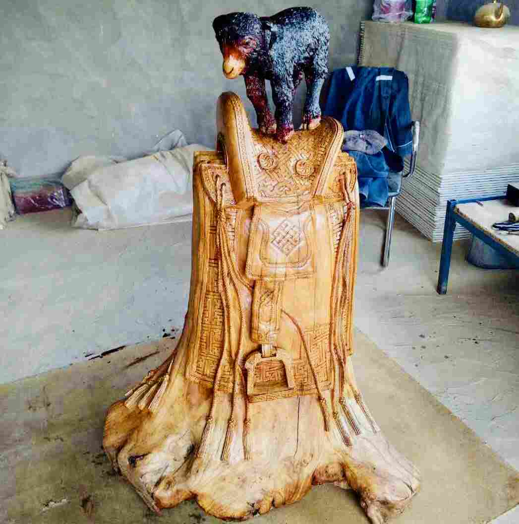 这份与木雕的缘分,宝音特古斯已坚守了20余年。谈及为何与木雕结缘,他的语气多了几分感慨:“2000年左右,我出了场车祸,腰受了伤,打那以后就干不了重活了。”那段日子,他一度陷入迷茫,直到想起从小就喜欢的牧区树木——那些形态各异的枝干、树根,曾是他童年最爱的“玩具”。“既然干不了重活,不如做些自己喜欢的事。”2000年,宝音特古斯拜师学习木雕技艺,从分辨木材特性、握稳刻刀开始,一点点摸索钻研。三年勤学苦练后,2003年,他终于能独立完成木雕作品,正式踏上木雕创作之路。
