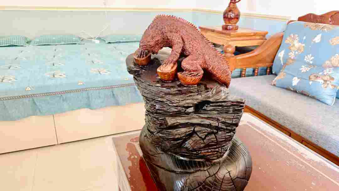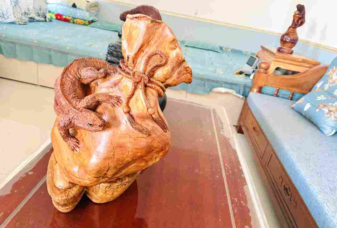 20多年的坚守,让宝音特古斯收获了诸多荣誉,其中最具分量的是八省区首届“天骄杯”民族手工艺品大赛木雕类一等奖。走进他的家,就像走进一个小型根雕博物馆:有用树根巧妙制成的鄂尔多斯褡裢、精致的笔筒、小巧的牙签筒、古朴的木雕枕头,以及形态各异的蜥蜴木雕……每一件都是他用匠心赋予枯根新生的见证。
